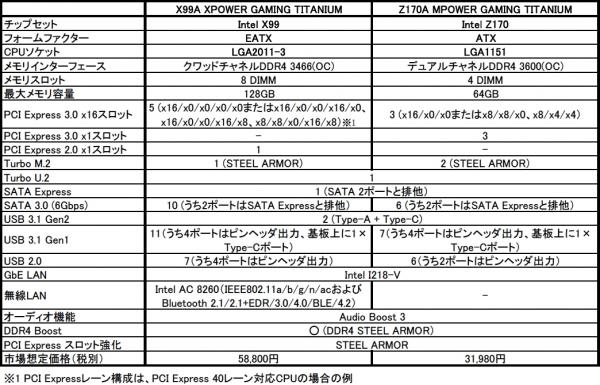 2016年7月8日-Micro-Star International Co., Ltd. 台湾・新北市- マザーボードの設計で世界をリードするMicro-Star International(MSI)は、オーバークロック性能に優れ、さまざまなゲーミング機能を搭載したTITANIUMシリーズに、Intel X99チップセットを搭載した「X99A XPOWER GAMING TITANIUM」と、Intel Z170チップセットを搭載した「Z170A MPOWER GAMING TITANIUM」の2製品を追加し、7月9日より販売を開始いたします。市場想定価格(税別)は、X99A XPOWER GAMING TITANIUMが58,800円、Z170A MPOWER GAMING TITANIUMが31,980円の見通しです。