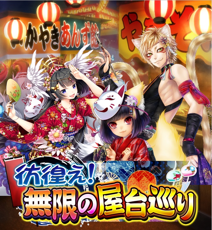 本イベントは、期間限定で公開されるシナリオイベントです。探索するほどに、多種多様な敵の妖怪たちと遭遇します。イベントシナリオ第1章をクリアすると、イベントで有利な限定キラーカード[R]を獲得することが出来、初心者でもイベントを楽に進めることが可能です。通常シナリオでは入手不可能な妖怪たちを仲間にしつつ、縁日を楽しみましょう!