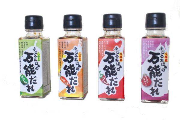 「ふじこおばぁの万能だれ」はにんにく醤油をベースに島生姜の香辛料をきかせたパパイヤ、スパイシー、ニンジン、ドラゴンフルーツの4種の味をご用意しています。