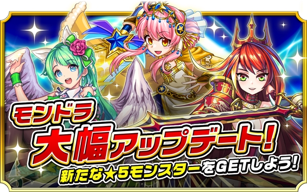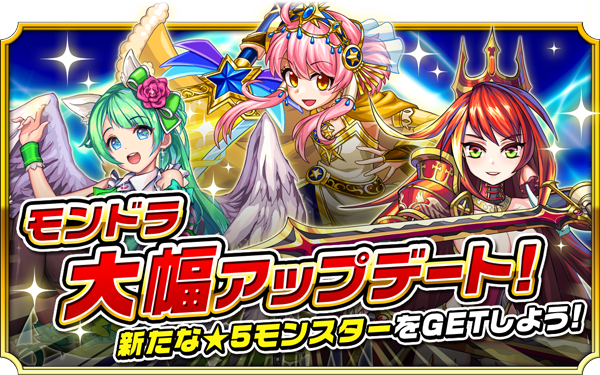 2016年7月13日(水)、大型アップデートを実施いたしました。ノーマルクエストの初クリア報酬に「★5新モンスター」が追加されるなど、アップデート後さらに面白くなった『モンドラ』を、是非お楽しみください。