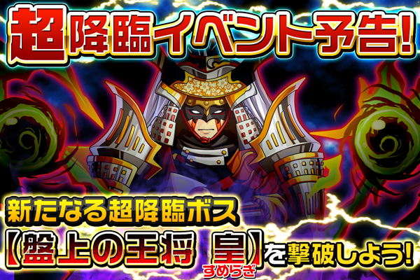 2016年7月15日(火)より、超降臨イベント『盤上の戦い』が期間限定で開催されます。当イベントで出現する超降臨ボス【★6盤上の王将 皇(すめらぎ)】を討伐すると、限定【★5光属性 皇】モンスターを獲得することができます。限定モンスター【★5光属性 皇】はクリアすると一定の確率でドロップします。
