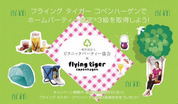 日本ホームパーティー協会が監修する「ホームパーティー検定」3級の受験料 先着合格者毎週10名分をフライング タイガー コペンハーゲンがプレゼントするキャンペーン。ホームパーティー検定3級の審査方法は通常、応募者に自身のホームパーティー風景画像を提出いただき審査を行いますが、同キャンペーンの課題提出条件は「フライング タイガー コペンハーゲン商品を1点以上」使用したホームパーティーの画像の提出をすること。また応募者の中から毎週5名に、フライング タイガー コペンハーゲン商品をプレゼントするダブルチャンスもご用意しています。