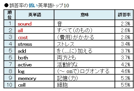 誤答率の低いトップ3の単語は、sound(音)、all(すべて)、cost((費用)がかかる)でした。