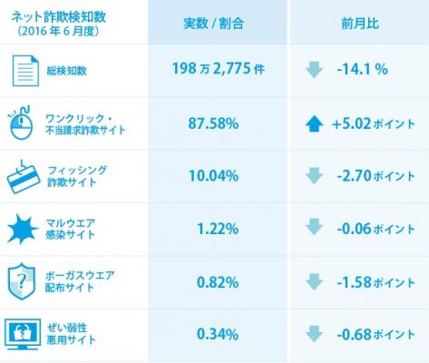 2016年6月度は、5月と比較して総検知数は若干減少したものの、引き続きワンクリック詐欺や不当請求サイトの検知数が非常に多い状態が続いています。実際に動画サイト閲覧で架空請求詐欺被害に遭い、100万円を超える電子ギフト券を購入させられる詐欺事件なども発生しています。犯罪グループは金銭に結び付く成果を上げられる限り、同様の手口を継続するものと考えられるため、引き続き消費者への注意喚起が必要です。