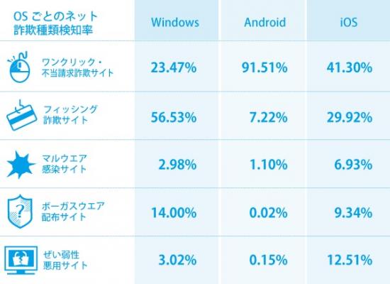 インターネット詐欺の種類別構成比は、ワンクリック・不当請求詐欺サイトが87.58% (前月比5.02ポイント増)、フィッシング詐欺サイトが10.04%(前月比2.7ポイント減)、マルウエア感染サイトが1.22%(前月比0.06ポイント減)、ボーガスウエア配布サイトが0.82%(前月比1.58ポイント減)、ぜい弱性悪用サイトが0.34%(前月比0.68ポイント減)でした。