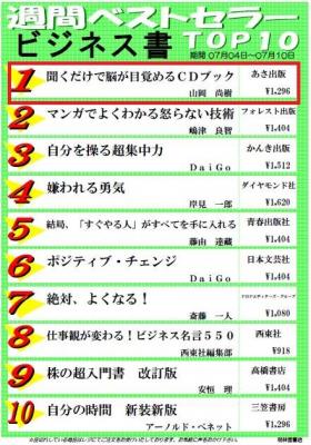 株式会社あさ出版(東京都豊島区池袋/代表取締役:佐藤和夫 http://www.asa21.com )が出版した、『聞くだけで脳が目覚めるCDブック』著者山岡尚樹が、7月14日明林堂書店チェーンでビジネス諸部門3週連続第1位、別部門から継続で5週連続第1位を獲得致しました。
