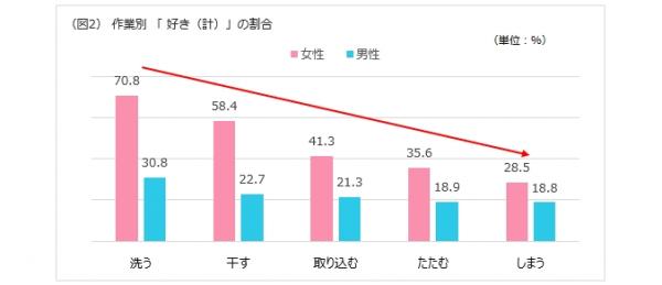 また、作業の好き嫌いを男女別に見ると、女性は『洗う』に関して7割が「好き(計)」と回答しているが、作業が後半になるにつれてその割合が下がる傾向にあり、男性よりも顕著であった。