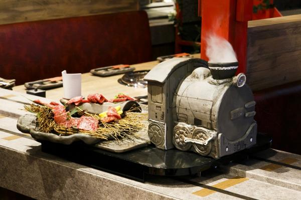 タッチパネルでメニューをオーダーすれば、店内の端から端へと敷かれたレールの上を、煙突から煙を出しながら、可愛い汽車に乗ってお肉が走ってくる新感覚エンタメ焼肉です。