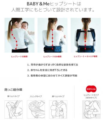 ヒップシートキャリア「BABY&Me(ベビーアンドミー)」は、従来の抱っこ紐に椅子のような台座が付いた、今までにない、まったく新しいスタイルのお座り型の抱っこ紐です。ヒップシートキャリアは、人間工学に基づき開発され、その優位性は、圧倒的な腰や肩への負担軽減です。世界20カ国以上で規制物質に関する認証された試験機関INTERTEKからの認証や、The Dads Awards 金賞・銀賞、英国Mumpreneur UKデザイン/機能/安全性部門シルバー賞を受賞しています。