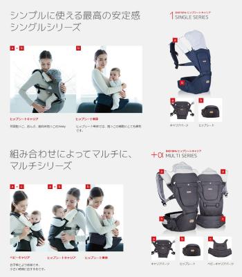 ヒップシートキャリア「BABY&Me(ベビーアンドミー)」には、「シングル・シリーズ」と「マルチ・シリーズ」の2シリーズがあります。「シングル・シリーズ」は、” ヒップシートキャリア&ヒップシート”のシンプルに使えるシリーズ。「マルチ・シリーズ」は、” ベビーキャリア&ヒップシートキャリア&ヒップシート”と組み合わせでマルチに使えるシリーズです。「マルチ・シリーズ ※2」は、赤ちゃんの成長に合わせて使い分けができるオールインワンタイプです。