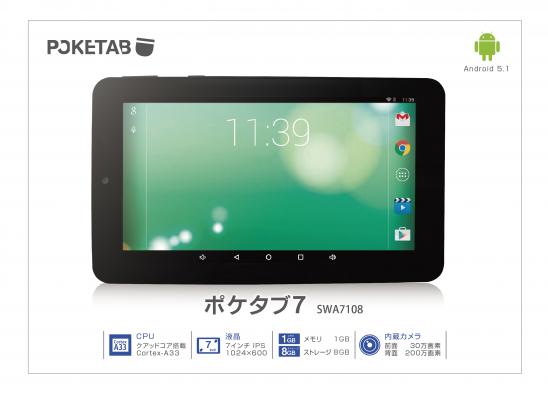 新ポケタブ7(型番SWA7108)は7インチで1024×600ドットのIPS液晶ディスプレイを搭載。OSにはAndroid5.1、CPUはCortex-A33 クアッドコア1.5GHz、メモリは1GB、ストレージは8GB。最大128GBまでのmicroSDカード(SDXC対応)を利用できます。メインカメラは200万画素、インカメラは30万画素。無線LANはIEEE802.11b/g/nでBluetooth4.0、GPS、加速センサーを搭載。バッテリー容量は2500mAh、大きさは約188×109×10.5mmで、重さは約264g。