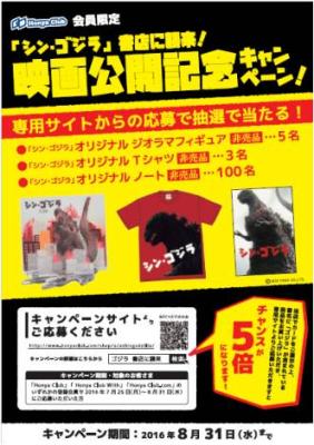 期間中、Honya Club.com内の特設ページでご応募いただいたお客様の中から抽選で計108名様に、非売品の「シン・ゴジラ」オリジナルグッズをプレゼントします。キャンペーン実施店および専用サイトにてタイトルに「ゴジラ」が含まれている本を購入すると、当選チャンスが5倍になります。