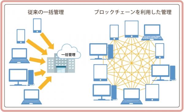 今まで中央一括管理していた情報をそれぞれの場所で個々に管理し、個々のその情報は鎖状に情報を時系列で取引記録をつないでいる。