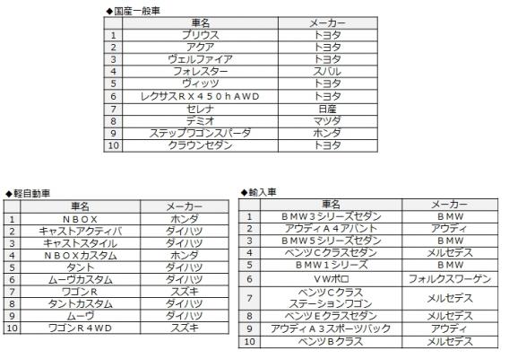 国産一般車部門は、今月もプリウス(トヨタ)がトップにランンクインし、人気が伺えました。軽自動車部門は、キャストアクティバの2位浮上を筆頭に、ダイハツ6車種が10位内に入りました。輸入車部門は、根強い人気となっているBMW3シリーズセダンがトップにランクインしています。
