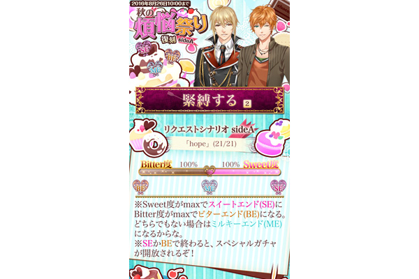 スウィートエンドかビターエンドを迎えると、スペシャルガチャが解放され、ガチャをプレイできるようになります!