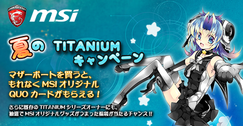 2016年7月29日-Micro-Star International Co., Ltd. 台湾・新北市- マザーボードの設計で世界をリードするMicro-Star International(MSI)は、TITANIUMシリーズマザーボードのいずれかをご購入いただいた方を対象に、もれなく2000円分のMSIオリジナルQUOカードをプレゼントする「夏のTITANIUMキャンペーン」を、7月30日~9月25日の期間で実施いたします。また、キャンペーン開始前にTITANIUMシリーズをご購入いただいた方を含む全ユーザーを対象として、SNSにお使いのシステムの写真を投稿していただくと、抽選で10名様にMSIプチ福袋をプレゼントする企画も実施いたします。