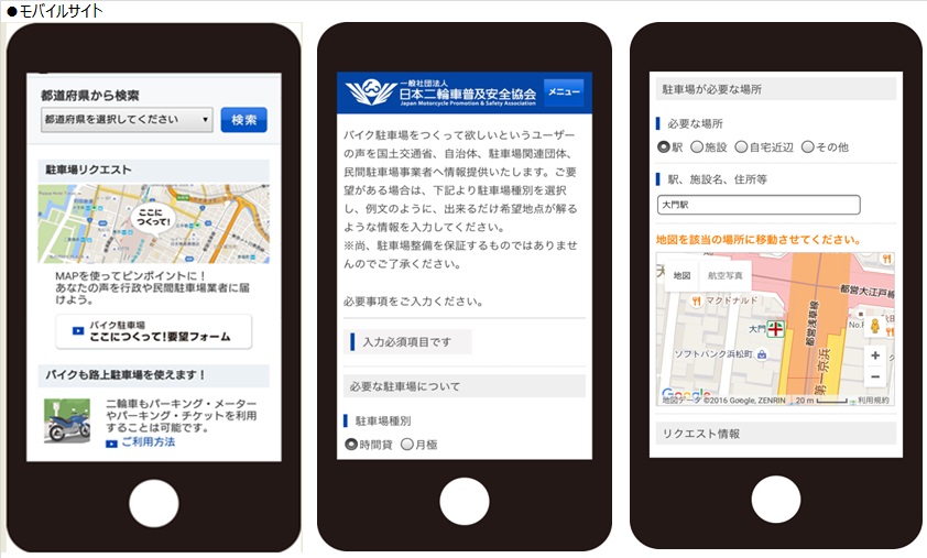 また、ユーザーの皆様より駐車場を作って欲しい場所の情報を集め、駐車場事業者や行政にお伝えすべく駐車場リクエスト「バイク駐車場ここに作って!要望フォーム」よりご意見を募集しておりますが、この度、フォームの改修を行い、駅名や施設名(ビル名)、住所を入力頂く事で、MAPを使用しピンポイントにリクエストが平成28年7月より可能となりました。