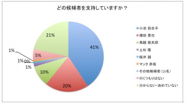 「どの候補者を支持していますか?」と質問をしたところ、「小池百合子」候補が41%と一番支持されており、続いて「増田寛也」候補と答えた方が20%、「鳥越俊太郎」候補と答えた方が10%という順番になりました。