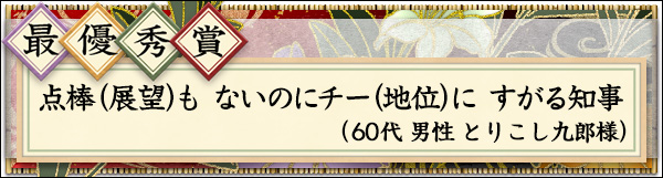点棒(展望)も ないのにチー(地位)に すがる知事 (とりこし九郎様・60代男性)