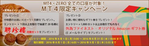 FX取引サービス「MT4・ZERO」を提供する外為ファイネスト株式会社(本社:東京都千代田区、代表取締役:石野由美子)は、2016年8月1日より、MT4・ZEROで1回以上取引された方の中から抽選で20名様に「聘珍楼の月餅セット」、更に1,000ロット以上取引でもれなく当社オリジナル「Amazonギフト券(Eメールタイプ) 5,000円分」をプレゼントする『MT4限定キャンペーン』を開催中です。