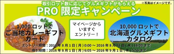 FX取引サービス「MT4・ZERO」を提供する外為ファイネスト株式会社(本社:東京都千代田区、代表取締役:石野由美子)は、2016年8月1日より、1,000ロット以上取引でもれなく「ご当地カレーギフトカード」、10,000ロット以上取引でもれなく「北海道グルメギフトカタログ」をプレゼントする『PRO限定キャンペーン』を開催中です。