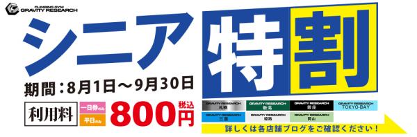 登山・アウトドア用品販売とクライミングジム運営を展開する株式会社好日山荘(本社:兵庫県神戸市)は8月1日(月)から9月30日(金)まで、全国のクライミングジム「グラビティリサーチ」において、55歳以上のご利用者にお得にクライミングをお楽しみいただくために「シニア特割」を実施いたします。