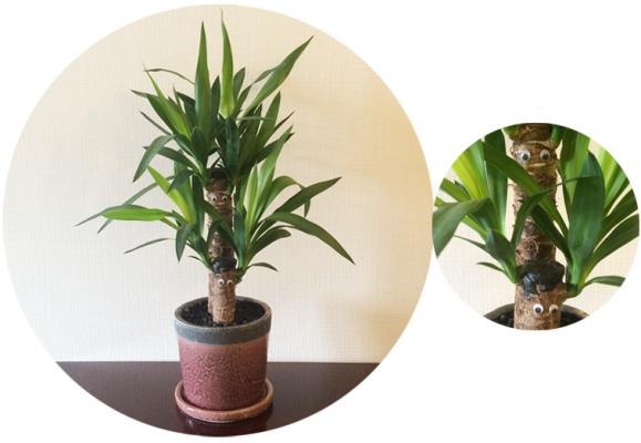 観葉植物ユッカ(青年の樹)の幹に目玉シールを貼ることで、思わずほっこり笑みのこぼれる可愛いインテリアグリーンとして楽しんでいただけます。