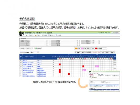 さらに募集型企画旅行の宿泊施設、交通機関の仮押さえ管理としても利用可能です。