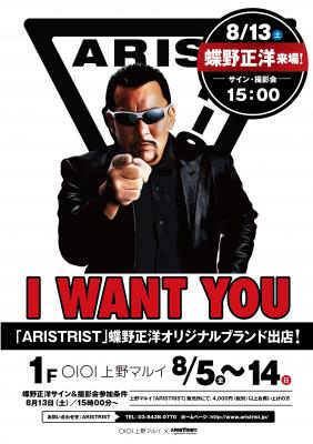 蝶野正洋オリジナルブランド「アリストトリスト」が、8月5日(金)~8月14日(日)まで、上野マルイに期間限定出店します。出店期間の8月13日(土)には、15:00より蝶野正洋来場のもとサイン&撮影会を行います!
