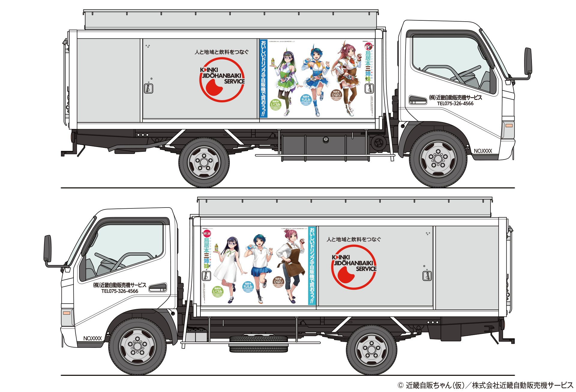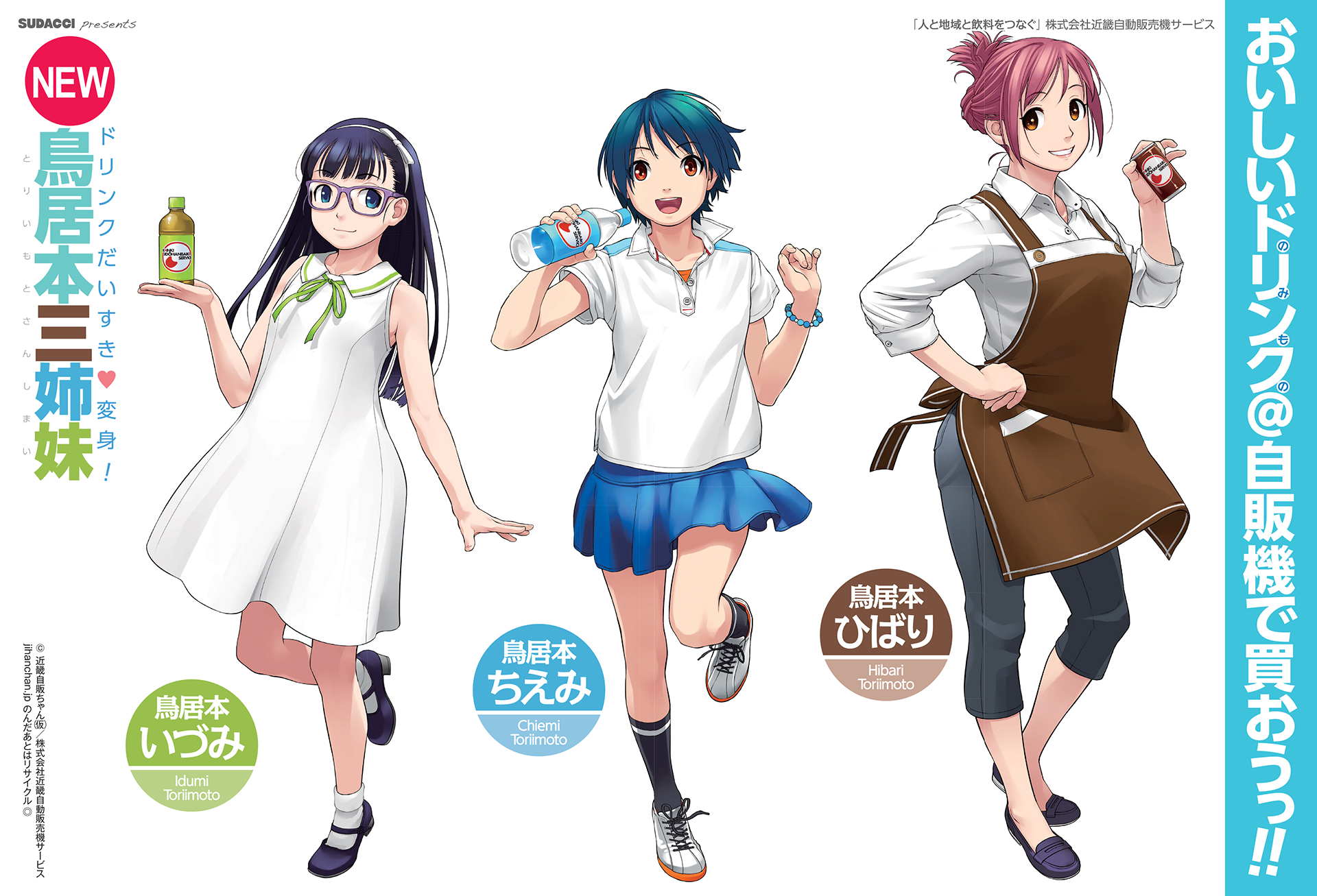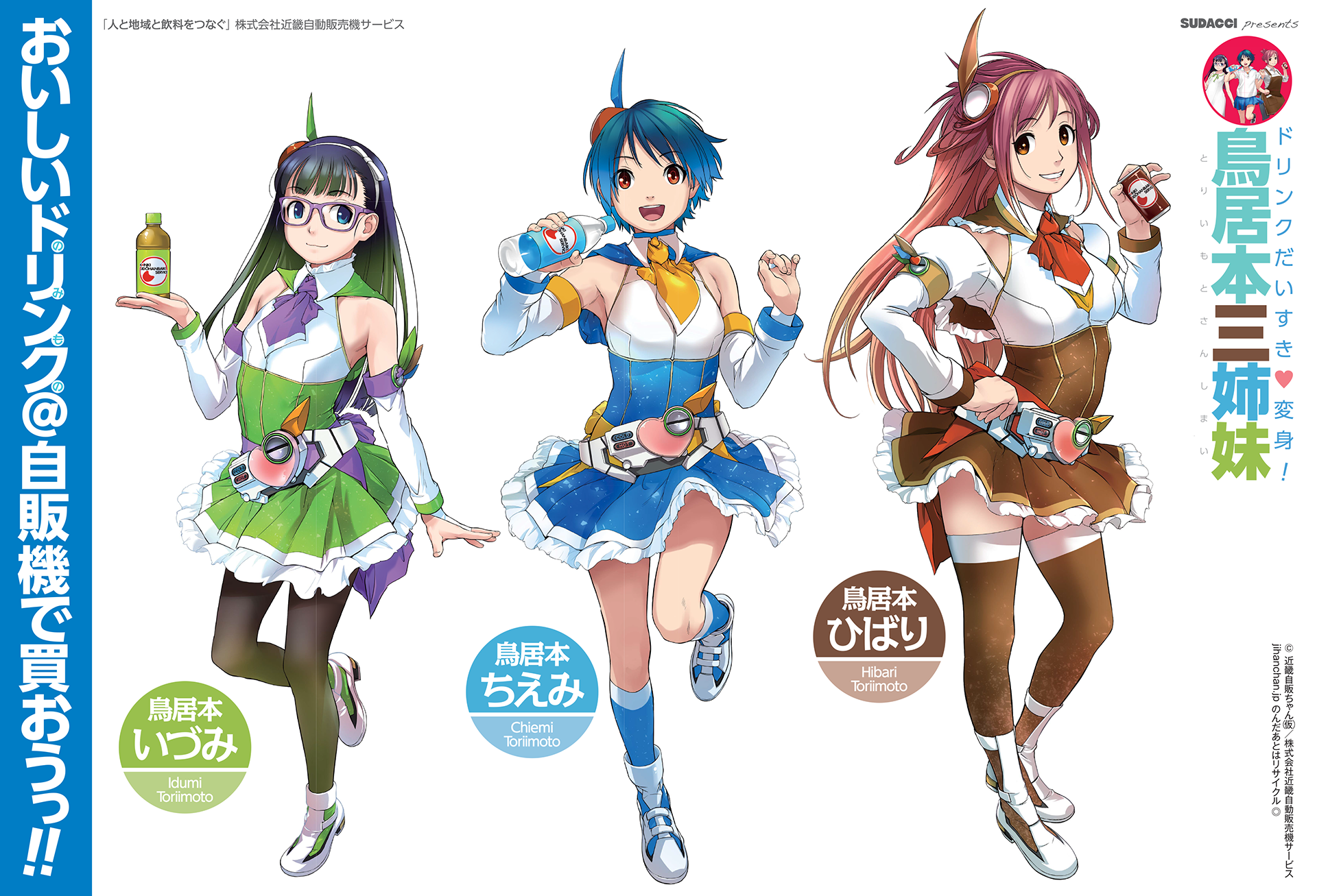 株式会社近畿自動販売機サービス(京都市南区吉祥院流作町18番地)とSUDACCI(有限会社アリゾナデザイン)は自動販売機のマーケティングに「二次元」イメージキャラクターを初めて起用し、2016年8月10日から同社の自動販売機広告とボトルカーラッピングでPRします。