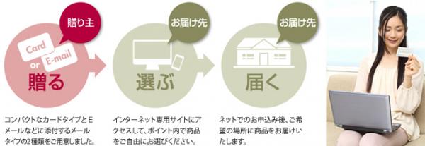 インターネットで商品と交換が可能なポイント型ギフトカードであり、外出しなくてもパソコン・スマホ・タブレットで楽々ショッピングが可能で、身体を動かしにくい妊婦さんやママにも安心である。勿論、宅配なので便利である。選べるアイテムは、国産のキッズ・ベビー・マタニティグッズおよび海外ブランドなど約500点を含め、生活応援グッズも多数揃った最大10,000点から選ぶ事が可能である。カタログギフトと異なりポイント型であり、いくつも選べる点も利用者メリットと考えられる。