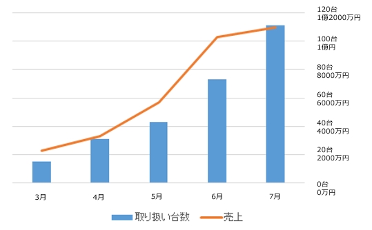 【月間取り扱い台数73台、月間売上1億円達成】