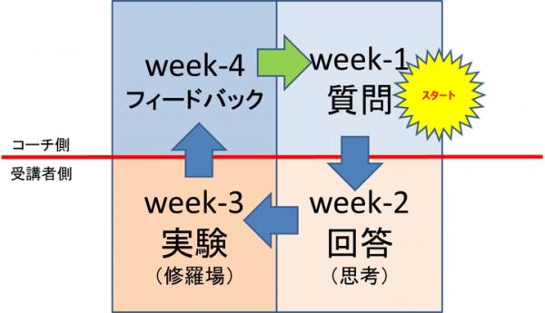 (1) 4週を1クルーとして、「質問->回答->実験->フィードバック」というシンプルなプロセスの繰り返しに、コーチの知見を加えることにより、個々人の成長意欲を成功に導きます。