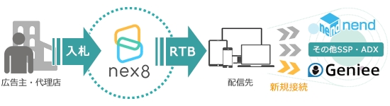 インターネット広告事業を展開する株式会社ファンコミュニケーションズ(本社:東京都渋谷区、代表取締役社長:柳澤安慶 東京証券取引所市場第一部:2461)が運営する、リターゲティング広告配信サービス「nex8(ネックスエイト)」<https://www.nex8.net/>は、2016年8月10日(水)より、株式会社ジーニー(本社:東京都新宿区、代表取締役社長:工藤智昭)が運営するSSP(※1)「Geniee SSP(ジーニー)」と接続し、RTB(リアルタイム入札)による広告取引を開始いたしました。