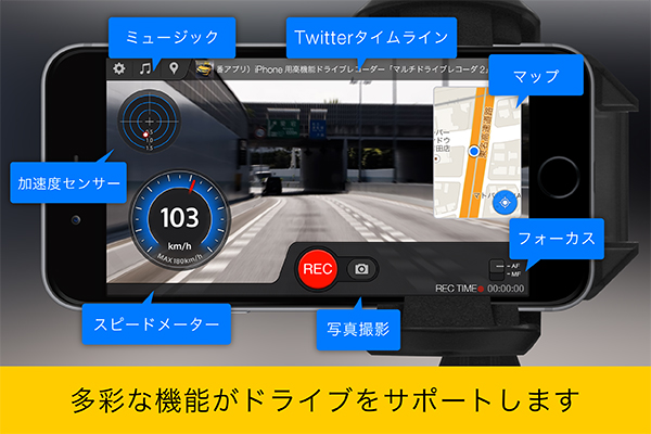 マルチドライブレコーダ2は、iPhoneのカメラを利用したドライブレコーダーアプリです。車に設置するだけでドライブレコーダーとして機能し、かつ画面に表示される速度計や地図、ツイッターなどのマルチな情報がドライブをサポートします。