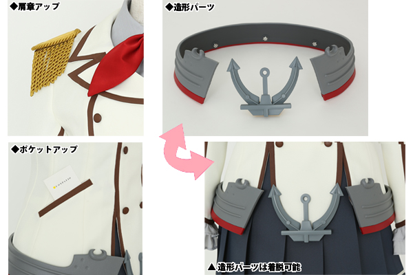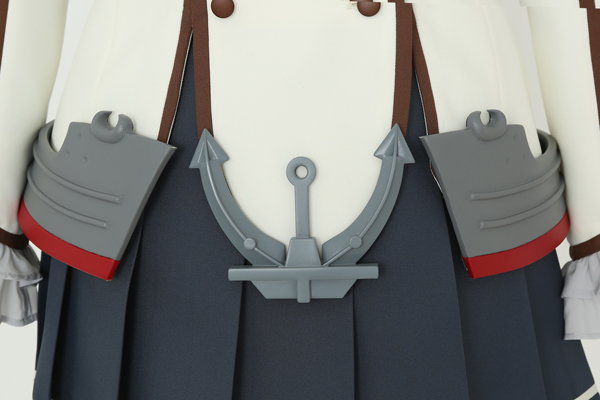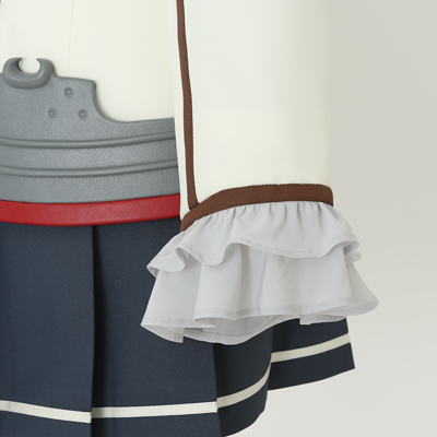 公式監修のもと、ジャケット裾の"船を模したパーツ"や"錨"を1点ずつ職人による手造りの本格造形仕様で再現。袖のフリルやベレー帽、特徴的な髪飾りなど、細部までこだわり国内工場で丁寧に製作した、可愛い鹿島の雰囲気にピッタリの制服となっております。