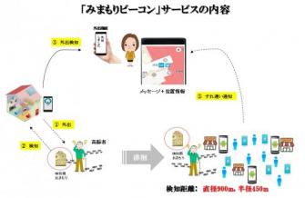 本サービスは、施設及び自宅にAndroid型の固定検知端末を設置し「御守り(ビーコン内蔵)」を持った高齢者の方の外出を検知し、ご指定の携帯番号にメッセージおよび位置情報を通知(SMS、LINE、AirTalkなど)することで、徘徊や行方不明を防ぎます。