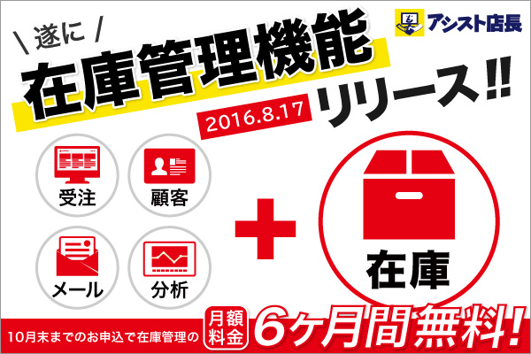 株式会社ネットショップ支援室(本社:福井県、代表取締役:泉 成人)は同社のECサイト一元管理システム「アシスト店長」において「在庫管理機能」を2016年8月17日にリリースしましたのでお知らせいたします。