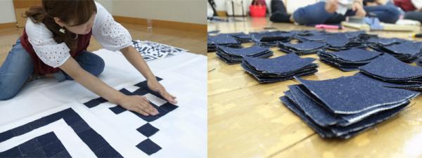 ・ 6センチ四方の正方形にデニムをカット、ピースを約250枚使用。