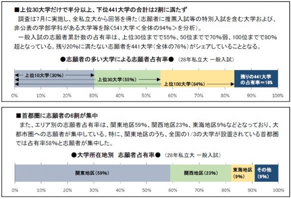 本調査により、志願者数の多かった上位30大学だけで、541大学の志願者総数の55%を占めることが判明したほか、関東地区の大学への志願者の占有率も60%近くになっていることがわかりました。
