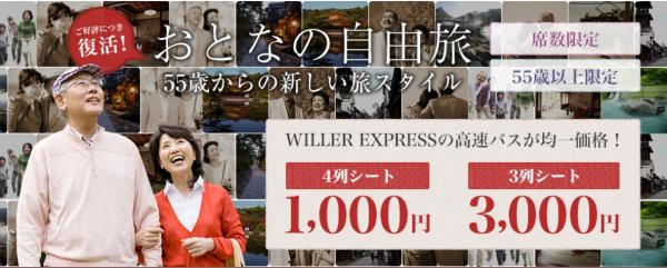 高速バス「WILLER EXPRESS」(以下ウィラーエクスプレス)を統括管理するWILLER EXPRESS JAPAN株式会社(http://travel.willer.co.jp/ 代表取締役:平山幸司)は、55歳以上のシニア方を対象に高速バスで日本全国を楽しむ旅を提案する『おとなの自由旅』を本日8月17日よりウィラートラベルサイト(http://travel.willer.co.jp/campaign/senior/)にて販売開始します。『おとなの自由旅』では、4列シートは1,000円均一、3列シートは3,000円均一で日本全国を高速バスで旅していただくことができます。(※)