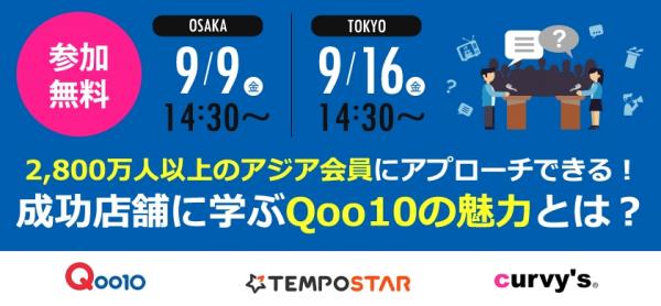 インターネット総合ショッピングモール「Qoo10(キューテン)」を運営するジオシス合同会社(東京都港区、代表 金 孝種)は、EC事業者向けに複数ネットショップ一元管理サービス「TEMPOSTAR(テンポスター)」を提供しているNHNテコラス株式会社(東京都新宿区、代表 稲積憲)と共同で、9月9日(金)大阪・9月16日(金)東京に、「成功店舗に学ぶQoo10の魅力」セミナーを開催します。