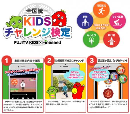 ヘルスケア、スポーツ教育事業をビジネス展開している株式会社ファインシード(本社:東京都渋谷区、代表取締役社長:頼定誠)は、株式会社フジテレビキッズ(本社:東京都港区、代表取締役社長:小畑芳和)との共同事業としてメダリストやギネス記録保持者が作成したカリキュラムに検定としてチャレンジできる『全国統一KIDSチャレンジ検定(チャレ検)』 の配信を2016年8月19日に開始致します。