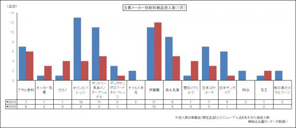 ■弊社で継続して調査している飲料新製品発売状況によると、主要メーカー21社における2016年7月の飲料商品投入数は合計50品目(前年同時期比27品目減)であった。メーカー別では、伊藤園が12品目(前年同時期比1品目増)で最も多い。以下、アサヒ飲料が6品目(同1品目減)、サントリー食品インターナショナル(同6品目減)と森永乳業(同4品目減)が各5品目、キリンビバレッジ(同9品目減)とカゴメ(同3品目増)、雪印メグミルク(同3品目増)が4品目で続く。