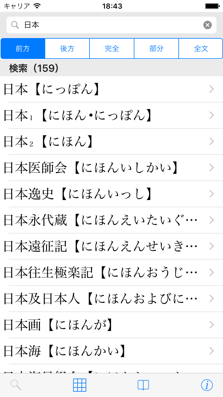 ●豊富な検索オプションを用意(前方一致/後方一致/完全一致/部分一致/全文検索)。それぞれの検索方法で、文字を入力すると候補見出し語が表示されるインクリメンタルサーチに対応(全文検索、部分一致検索を除く)