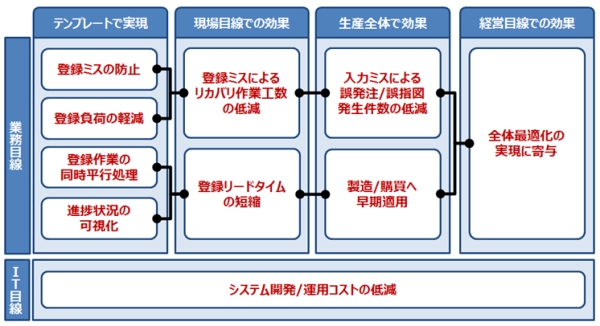 製造業務の効率化の為に導入されたシステムには、「品目のマスタ情報」が必要です。1つの製品毎に、使用する複数の部品登録を行なうのですが、このマスタ情報が様々な理由により正しく登録されず、発注の過不足や集計の不具合が発生するケースが多く見られます。これらの問題に対しこのテンプレートを適用すると、マスタ情報を正しく登録することができ、その後に頻発していたトラブルや、リカバリーの手間・余計なコストなどを削減し、現場の製造工程をスムーズに進行させることができるようになります。