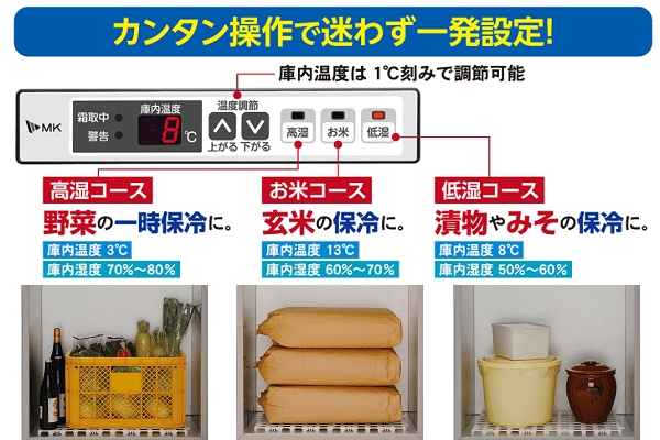 野菜貯蔵に適した「高湿コース」、お米貯蔵には「お米コース」、漬物や味噌貯蔵に最適な「低湿コース」の3コースを搭載し、ニーズに合わせてマルチにご活用いただけます。