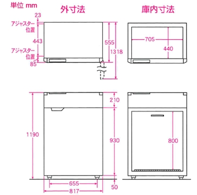 (1)幅817mm×高さ1190mm奥行き555mmのコンパクトな低温貯蔵庫です。