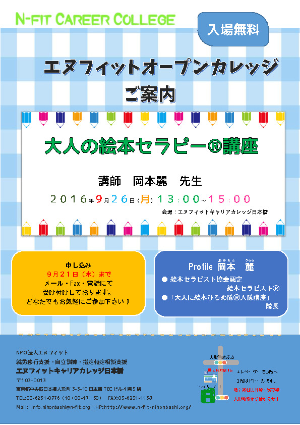 障がい者の就労と自立を支援するNPO法人エヌフィット(東京都中央区)は、来たる9/26(月)、講師の岡本麗先生をお迎えし「大人の絵本セラピー(R)講座」と題しイベントを開催します。