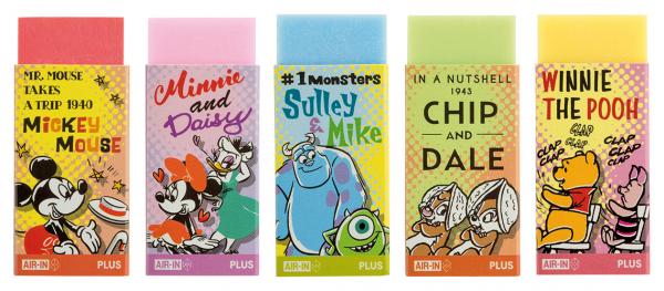 デザインは2製品共通、ミッキーマウス、ミニー&デイジー、サリー&マイク、チップ&デール、くまのプーさんの全5種類。メーカー希望小売価格(税抜)は修正テープ「ホワイパーPT」が300円(交換テープは定番品と共通で130円)、消しゴム「エアイン」は130円です。